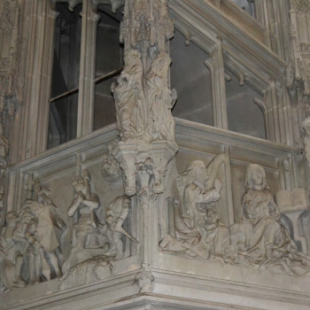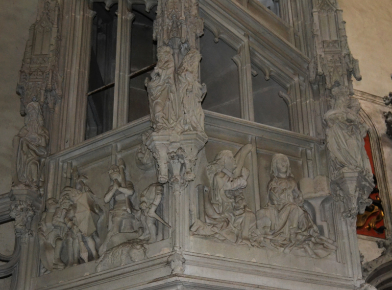 Auf den ersten Blick mag die heterogene Zusammenstellung der Brüstungsszenen verbindungslos, gar willkürlich erscheinen, jedoch sind diese über sogenannte ‚typologische Bezüge‘ miteinander verwoben. Als Typologie bezeichnet man die Vorbildung des Heilswirkens Christi, dem das Neue Testament gewidmet ist, in alttestamentarischen Ereignissen (Bloch 2015, 395). In der Vielheit der ... mehr anzeigenAuf den ersten Blick mag die heterogene Zusammenstellung der Brüstungsszenen verbindungslos, gar willkürlich erscheinen, jedoch sind diese über sogenannte ‚typologische Bezüge‘ miteinander verwoben. Als Typologie bezeichnet man die Vorbildung des Heilswirkens Christi, dem das Neue Testament gewidmet ist, in alttestamentarischen Ereignissen (Bloch 2015, 395). In der Vielheit der Geschichten des AT und NT können Einheiten gesucht und Beziehungen gestiftet werden. Dabei können sowohl Übereinstimmungen als auch feine Differenzen anhand spezifischer Beispiele sinnträchtig durchdekliniert werden. Typologie ist damit nicht nur die Grundstruktur der Erzählweise der biblischen Heilsgeschichte, sondern erweist sich auch als ein fruchtbares Verfahren der Bibelexegese. (Kemp 1994, 75-86)Im konkreten Falle des Konstanzer Schneggs konstituiert sich der typologische Bezug zwischen dem Typus der Gideon-Geschichte und dem Antitypus der Verkündigung hinsichtlich der unbefleckten Empfängnis Mariens, die mit der ebenso wundersamen Betauung des Fells durch Gott korrespondiert: Das Widderfell ist damit ein antizipierendes Symbol für die Jungfräulichkeit Mariens. Des Weiteren manifestiert sich im Sinnbild des brennenden, sich jedoch nicht verzehrenden Dornbusches der typologische Bezug zur Geburt Christi, der auf die unversehrte Jungfräulichkeit Mariens trotz Schwangerschaft und Geburt hinweist. (Hubert 2013, S. 128ff.) Im Folgenden soll der erzählerische Mehrwert dieses relationierenden Modus (vgl. dazu grundlegend Bogen 2001, 379ff.) schrittweise weiter entfaltet werden. weniger anzeigen