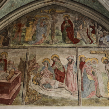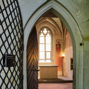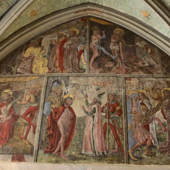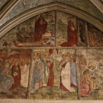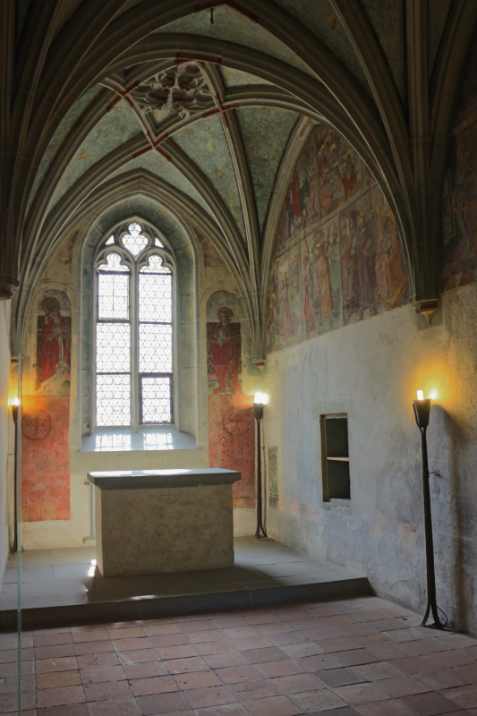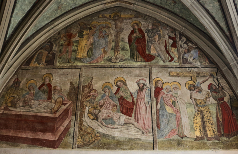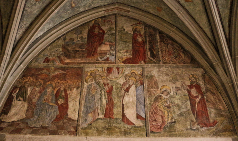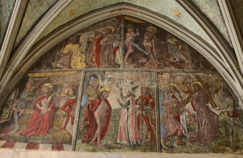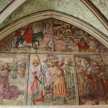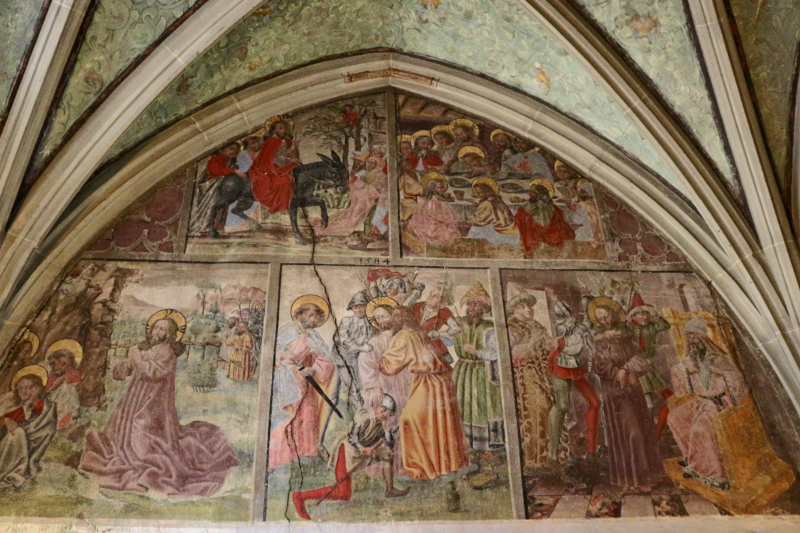 Die unscheinbare Spitzbogentür lässt von außen kaum erahnen, welch reiche Ausmalung im Inneren der Sylvesterkapelle darauf wartet, entdeckt zu werden. In den vier Jochen der Seitenwände entfaltet sich in 19 ungleich proportionierten Feldern die Passion Christi, von seinem Einzug auf einem Esel in Jerusalem an Palmsonntag bis hin zur Ausgießung des Heiligen Geistes an Pfingsten (Gröber ... mehr anzeigenDie unscheinbare Spitzbogentür lässt von außen kaum erahnen, welch reiche Ausmalung im Inneren der Sylvesterkapelle darauf wartet, entdeckt zu werden. In den vier Jochen der Seitenwände entfaltet sich in 19 ungleich proportionierten Feldern die Passion Christi, von seinem Einzug auf einem Esel in Jerusalem an Palmsonntag bis hin zur Ausgießung des Heiligen Geistes an Pfingsten (Gröber 1914, 185-189). Die Szenen wurden in zwei Registern angeordnet, wobei die Leserichtung an beiden Wänden Joch für Joch von Osten (Fensterseite) nach Westen (Türseite) ausgerichtet ist. An der ehemaligen Altarseite der Ostwand rahmen links der Hl. Sylvester sowie rechts Maria Magdalena das ornamental ausgeschmückte Fenster. An der gegenüberliegenden Westwand findet sich eine eindrückliche Weltgerichtsdarstellung.Ebenso spannend wie aufschlussreich gestaltet sich ein Vergleich des Passionszyklus mit dem wahrscheinlich nur wenige Dekaden zuvor entstandenen Nikolauszyklus in der heutigen Schatzkammer in Hinblick auf die narratologischen Strategien, Komposition und Stilistik. Die dort unternommenen Ansätze, komplexere Raumentwürfe zu kreieren, die in den Dienst einer gleichfalls komplexeren Binnenerzählung gestellt wurden, erscheinen hier – der Entstehungszeit entsprechend – weitergeführt und vertieft. Versuchen wir also in den nachfolgenden Bildboxen zum Passionszyklus, Momente dieser Weiterentwicklung der bildräumlichen Erzählweise konkret herauszuarbeiten. weniger anzeigen