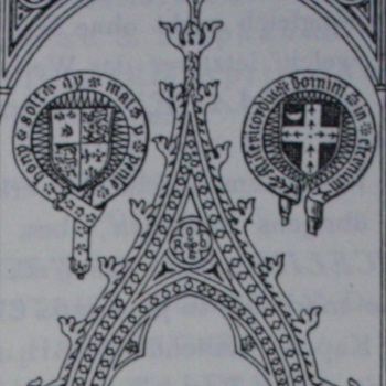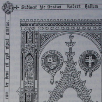 Die Verbindung zu England wird auch durch die Wappen angezeigt: Auf der linken Seite ist das Wappen des englischen Königs abgebildet, das von einem Schriftband umgeben ist. Auf diesem ist das Ordensmotte hony soit qui mal y pense (Ein Schelm, der Böses dabei denkt) des Hosenbandordens – einem der höchsten, englischen Orden – lesbar (Studenitz 1981, 19 ff). Das rechte Wappen ist das von Robert Hallum selbst, das durch die Worte misericordias domini in eternum (Ich werde in Ewigkeit die Barmherzigkeit des Herren besingen) eingerahmt ist (Stadie 2013, 88).