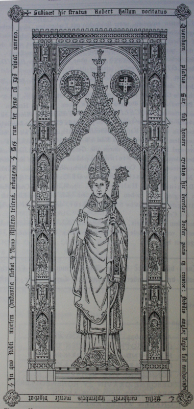 Der Anfang der Inschrift, die die Platte umrahmt, befindet sich in der linken oberen Ecke neben dem Vierpass. Von dort aus ist folgendes zu lesen: Subiacet hic stratus Robert Hallum vocitatus: | Quandom p(re)latus Sar(esberiensis) sub honore creatus: | Hic decretor(um) doctor pacis q(ue) creator: | Nobilis anglo(rum) Regis fuit amabaciator | Festu(m) Cuchberti septembris mense vigebat : | In quo Rob(er)ti mortem Constantia flebat: Anno Milleno tricent(esimo) octuageno | Sex cu(m) ter deno cu(m) xpo uiat ameno (Hier liegt ausgestreckt der oft genannte Robert Hallum | einst ehrenvoll als Bischof von Salisbury gewählt | er war Doktor des kirchlichen Rechts und als Bischof und Friedensstifter | Botschafter des vornehmen englischen Königs | Am Festtag des Cuthbert im Monat September lebte er in voller Stärke | im Jahre 1416, er möge mit dem leiblichen Christus leben) (Übers. d.A., Stadie 2013, 88, Anm. 14) Die aufgeführten Verdienste auf der Grabplatte schaffen – ähnlich wie auf der Tumba in dem Epitaph für Georg Sigismund Miller – eine Verbindung zwischen seinem Leben und seinem Tod.