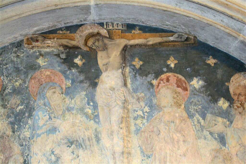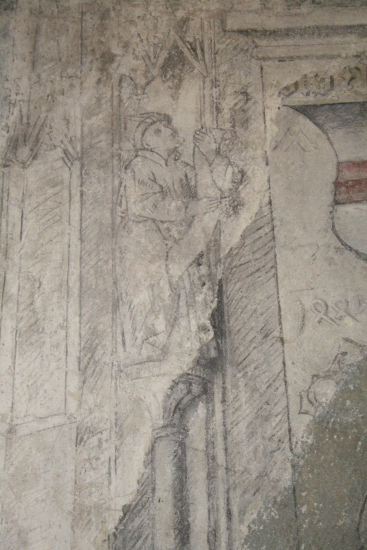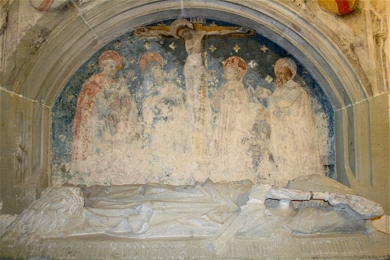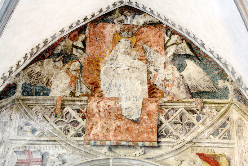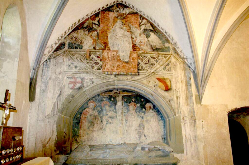 Eines der kunsthistorisch interessantesten Objekte des Konstanzer Münsters ist das Grabmal des Bischofs Otto III. von Hachberg. Es befindet sich in leider schlechtem Erhaltungszustand an der Südwand der Margaretenkapelle. Auf der Deckplatte des Hochgrabes ist der Bischof im Hochrelief zu sehen. Die Längsseite der Tumba ist mit rundbogigen Blendarkaden geschmückt, in welchen von links nach ... mehr anzeigenEines der kunsthistorisch interessantesten Objekte des Konstanzer Münsters ist das Grabmal des Bischofs Otto III. von Hachberg. Es befindet sich in leider schlechtem Erhaltungszustand an der Südwand der Margaretenkapelle. Auf der Deckplatte des Hochgrabes ist der Bischof im Hochrelief zu sehen. Die Längsseite der Tumba ist mit rundbogigen Blendarkaden geschmückt, in welchen von links nach rechts die Wappen von Baden bzw. der Grafen von Hachberg-Sausenberg, des Bistums Konstanz und der Grafen von Freiburg festgehalten sind. Die äußeren Wappen verweisen auf die familiäre Herkunft des Bischofs aus dem Geschlecht derer von Hachberg väterlicherseits bzw. der Grafen von Freiburg mütterlicherseits.In der Nischenmalerei über dem Hochgrab ist die Kreuzigung Christi mit Petrus, Maria, Johannes und Paulus dargestellt. Nur noch schwer erkennbar sind Otto von Hachberg selbst und sein Bruder Wilhelm. Sie knieten einst im Vordergrund des Wandgemäldes. In der oberen Bildzone dominiert die Erscheinung Marias, die ein Strahlenkreuz aussendet. Mit Engeln umgeben steht die Gottesmutter auf einer balkonähnlichen Architektur und präsentiert ihr Kind. Die perspektivisch angelegte Scheinarchitektur beinhaltet zudem erneut die Wappen des Bistums Konstanz (links) und der Grafen von Hachberg-Sausenberg aus dem Haus Baden (rechts).
