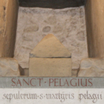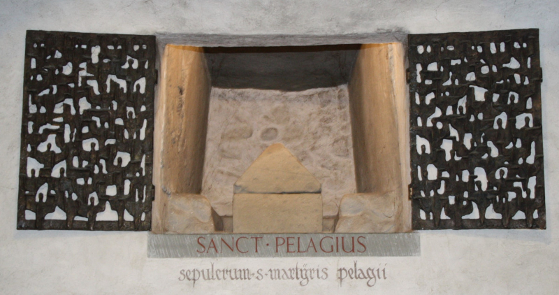 Der Reliquienschrein des hl. Pelagius befindet sich in der Krypta, dem ältesten Teil des Konstanzer Münsters. Die Reliquien wurden vermutlich unter dem Bischof Salomo I. Mitte des 9. Jahrhundert von der Stadt Ernona (röm. Provinz Oberpanonien) überführt und befinden sich bis heute an der ursprünglichen Stelle. Die Gruft, in der sich der Steinschrein befindet, ist 0,12 m in den Boden eingelassen und 1,06 m hoch, während der Schrein selbst innerhalb der Gruft in einem 0,35 m tiefen Schacht lagert. (Prange 2012, 116 ff)