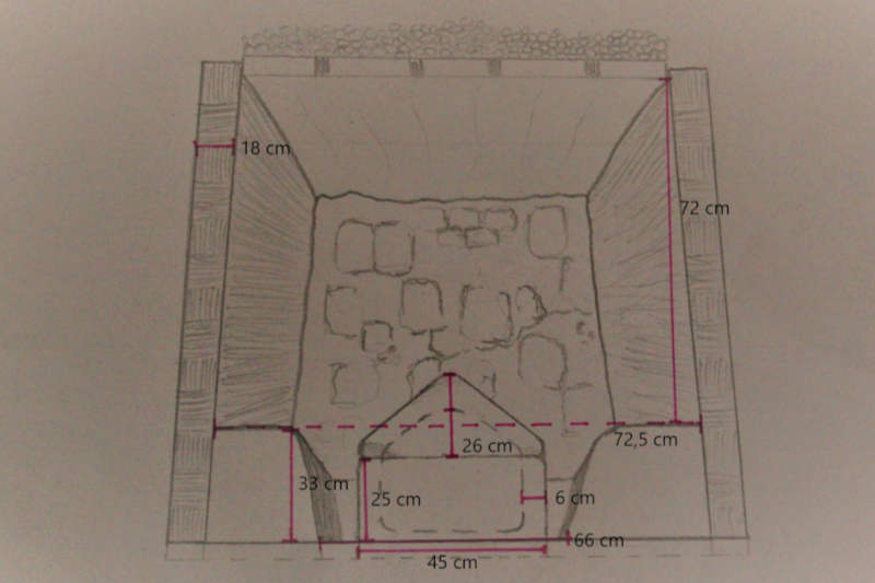 Der heute zu sehende und viel einfacher gestaltete Steinsarkophag liegt in einer grabartigen Vertiefung in der originalen, fast quadratischen Graböffnung (Laule / Lohrum 2013, 64 f). Ursprünglich war die Grabkammer wahrscheinlich durch einen Schacht mit dem darüber liegenden Altar verbunden. Heute ist diese Öffnung verschlossen. Der Deckel des Schreins ist satteldachförmig und wie die Längswand in mehrere Stücke zerbrochen. Im Gegensatz zu den sichtbaren Teilen ist der Kastenboden unbearbeitet (Reiners 1955, 138 ff)