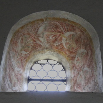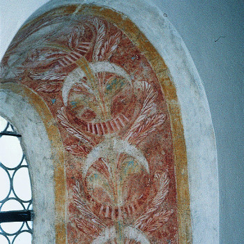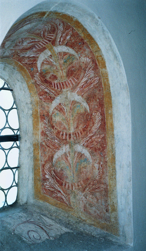 Die Ornamente der Fensterlaibung wurden maltechnisch ähnlich angelegt wie die vertikalen Ornamentstreifen des Wunderzyklus. In beiden Fällen lassen sich Einstichpunkte zur Konstruktion der kreisförmigen Grundform nachweisen. Auch der Aufbau der Farben stimmt mit den ältesten, im Mittelschiff jedoch überarbeiteten Malschichten überein. Die Grundornamente und die Akanthusblätter wurden mit einer hellroten Farbe angelegt. Die Blätter wurden dann in einem weiteren Arbeitsgang dunkelrot und gelb ausgearbeitet. Akzente wurden mit blauen Pigmenten gesetzt, die an den inneren Blättern und an den Punktrosetten hervortreten. Anschließend wurde das gesamte Ornament mit einer weißen Farbe modelliert. Besonders flächendeckend ist die Weißtönung in den inneren „Sicheln“ der Ringe.