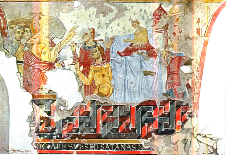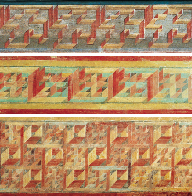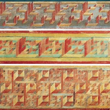 Damit wird ein starker Bildeffekt erzielt, in der die optische Wirkung des Ornaments stark von seiner graphischen Herstellung abweicht. Die perspektivische Ausrichtung unterstreicht die von den Christus-Darstellungen vorgegebene Aktions- und Leserichtung der Malereien, die auf der Nordwand zum Altar hin und auf der Südwand wieder zurück zum Kirchenportal führt. weniger anzeigen