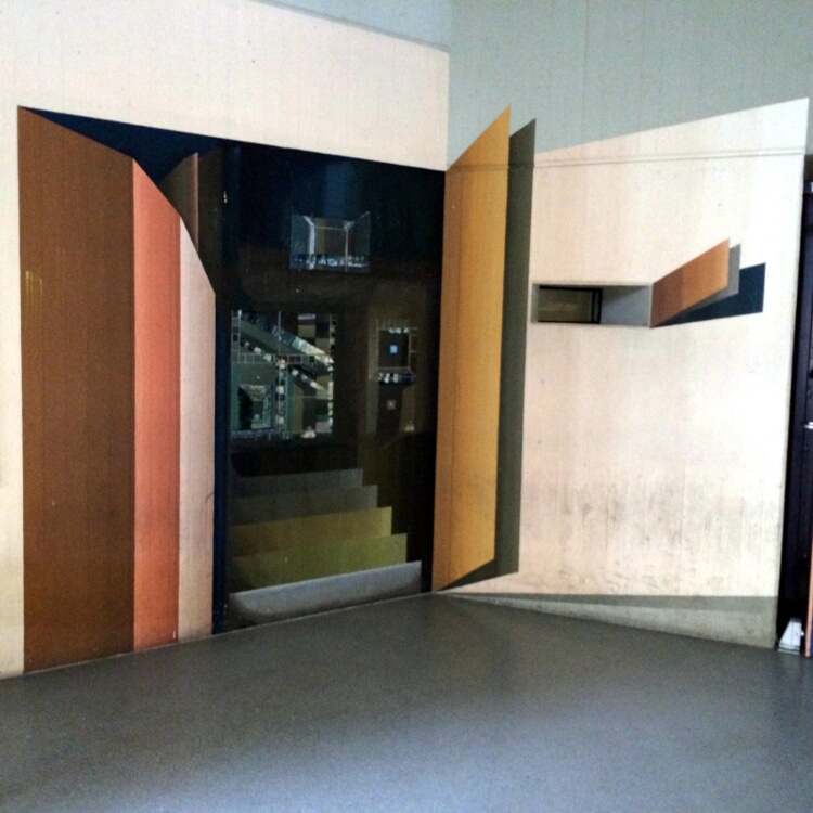 Das Werk von Ulrich Günther beruht auf der illusionistischen Wirkung der Malerei. Diese ist vor allem für den augenfällig, der die Treppenstufen hinaufsteigt. Perspektivisch wirkende farbige Balken führen die realen Treppenstufen im Gemälde weiter. Der Raum scheint für den, der auf dem Treppenabsatz ankommt, nicht zu enden. Die Malerei greift noch weitere Aspekte der Realarchitektur ... mehr anzeigenDas Werk von Ulrich Günther beruht auf der illusionistischen Wirkung der Malerei. Diese ist vor allem für den augenfällig, der die Treppenstufen hinaufsteigt. Perspektivisch wirkende farbige Balken führen die realen Treppenstufen im Gemälde weiter. Der Raum scheint für den, der auf dem Treppenabsatz ankommt, nicht zu enden. Die Malerei greift noch weitere Aspekte der Realarchitektur auf: Verschiedene, in unterschiedlichen Stufen der Öffnung gleichzeitig gemalte Türen und Türchen geben den Blick in wirkliche und imaginäre Räume frei.Das Werk ist in Acrylfarbe realisiert, doch sind auch glasierte Keramikfliesen, gleichsam als reale Kunstwerke, in das illusionistische Bild integriert. Günthers Kunst am Bau-Beitrag fasziniert nicht nur dadurch, dass er in ein raffiniertes Spiel mit der gebauten Architektur und deren Benutzer tritt. Es handelt sich um eine reflektierte Form der Trompe l’œil-Malerei, die ihre illusionistische Wirkung ausstellt und sich dabei an der Wirklichkeit reibt.