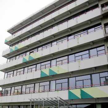 Gert Riels „Fassadenbemalung“ setzt einen starken Kontrapunkt zu den durch lange, horizontale Balkonbänder monoton gegliederten Außenwände des Chemiegebäudes M. Die beiden Fassaden, die rechtwinklig aneinander anschließen, werden durch die zwei gegenläufigen, nach oben auseinanderstrebenden diagonalen Bemalungen gleichzeitig aneinandergebunden und gegeneinander abgesetzt.Die beiden ... mehr anzeigenGert Riels „Fassadenbemalung“ setzt einen starken Kontrapunkt zu den durch lange, horizontale Balkonbänder monoton gegliederten Außenwände des Chemiegebäudes M. Die beiden Fassaden, die rechtwinklig aneinander anschließen, werden durch die zwei gegenläufigen, nach oben auseinanderstrebenden diagonalen Bemalungen gleichzeitig aneinandergebunden und gegeneinander abgesetzt.