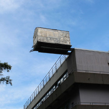 Unter Studiolo versteht man einen Raum zum aktiven Studieren und kontemplativen Reflektieren über die Künste. Bernhard Härtters „Studiolo Konstanz“ ist allerdings für den Betrachter unzugänglich. Und zwar auf zweierlei Weise. Wie ein dem Abgrund entgegenrasender Waggon ragt das Werk über das Dach des Verfügungsgebäudes seitlich hinaus. Am nächsten heran kommt man ihm über die ... mehr anzeigenUnter Studiolo versteht man einen Raum zum aktiven Studieren und kontemplativen Reflektieren über die Künste. Bernhard Härtters „Studiolo Konstanz“ ist allerdings für den Betrachter unzugänglich. Und zwar auf zweierlei Weise. Wie ein dem Abgrund entgegenrasender Waggon ragt das Werk über das Dach des Verfügungsgebäudes seitlich hinaus. Am nächsten heran kommt man ihm über die Terrasse im sechsten Stock. Dort entdeckt man eine zweite Unzugänglichkeit: Durch ein Vorhängeschloss bleibt das Innere des Studiolos dem Betrachtenden versperrt. Trotzdem bietet es Raum für Reflexion. Aus verschiedensten Edelstahlplatten gefertigt, spiegelt es die Sonnenstrahlen. Es ist auf Schienen ähnlichen Trägern angebracht. Auch die Form erinnert an einen Zugwaggon. Seine Bewegung, vom Gebäude weg, scheint durch das Abknicken der Schienen vorgegeben. Wie das Verfügungsgebäude ist das Studiolo ein Ort des Forschens. Es gehört zu ihm, strebt aber gleichzeitig von ihm weg.