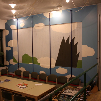 Burkhart Beyerle war von 1964 bis 1993 Mitarbeiter des Universitätsbauamtes. Der Architekt beteiligte sich nicht an den Ausschreibungen und Wettbewerben für Kunst am Bau an der Universität Konstanz, sondern war davon unabhängig künstlerisch tätig. Insgesamt fünf Aufenthaltsräume in den Naturwissenschaften sowie das Treppenhaus im Bereich L5/6 versah er mit farbenfrohen Wandmalereien. ... mehr anzeigenBurkhart Beyerle war von 1964 bis 1993 Mitarbeiter des Universitätsbauamtes. Der Architekt beteiligte sich nicht an den Ausschreibungen und Wettbewerben für Kunst am Bau an der Universität Konstanz, sondern war davon unabhängig künstlerisch tätig. Insgesamt fünf Aufenthaltsräume in den Naturwissenschaften sowie das Treppenhaus im Bereich L5/6 versah er mit farbenfrohen Wandmalereien. Diese Arbeiten bezeichnete er einmal als „Narrenfreiheit eines Gebäudeplaners“, sah sie aber nie als Kunst am Bau an.Die von ihm bemalten Wände der Aufenthaltsräume stehen jeweils im rechten Winkel zu Fensterfront und scheinen vom Fensterausblick inspiriert zu sein: Zahlreiche Wolken, stilisierte Fenstergitter und Licht-Schattenspiele setzen den realen Fensterausblick im Bild fort.