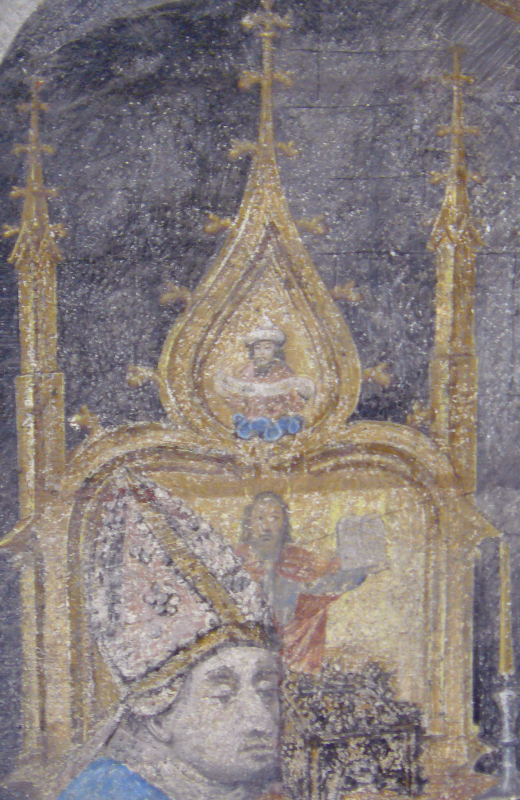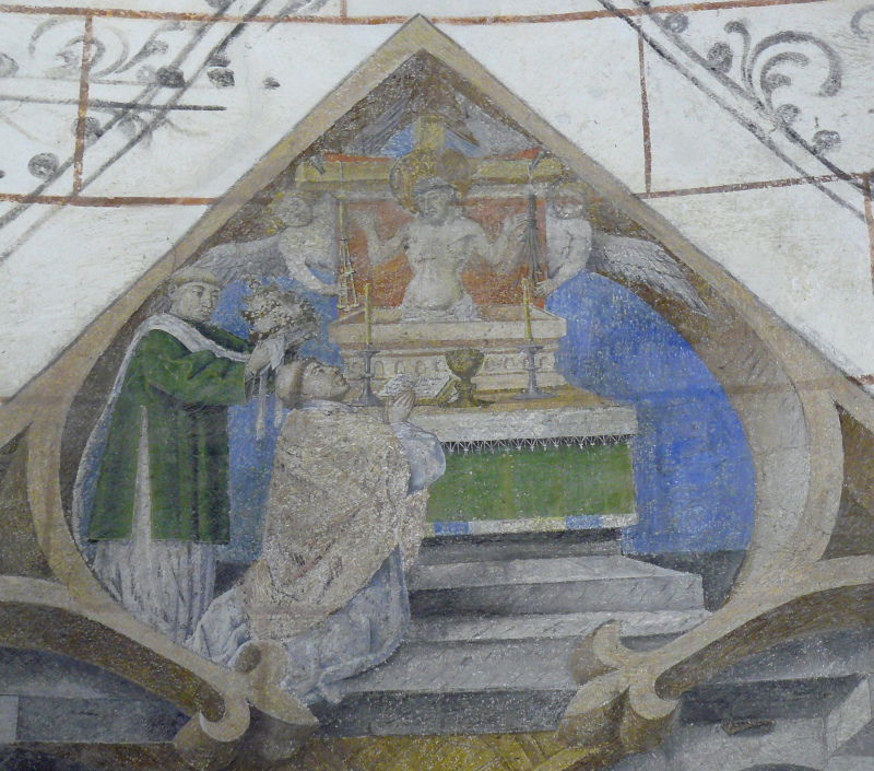 mehr anzeigenErstaunlich ist die Kombination und Komposition der beiden Bildthemen der Malerei: Tempelgang Mariens und Gregorsmesse erscheinen in einer Art Haus zusammengefügt. Das vorchristliche Thema im Tempel unten gipfelt in der Erscheinung Christi als Haupt der christlichen Kirche oben – eine räumliche, temporale, aber auch sakrale Hierarchie.Die Abbildung Marias als Tempeljungfrau war sicherlich der stark gestiegenen religiösen Bedeutung der Muttergottes geschuldet. So konnte die Münsterpatronin auch in der Rotunde an mehreren Stellen verehrt werden. Ihr Aufstieg zum Altar spricht für ihre Nähe zu Gott und die damit verbundene Mittlerrolle. Den Höhepunkt der Malerei bildet aber die Erscheinung des Erlösers als Schmerzensmann. Sein Anblick galt unter den nach Gnadenerwerb strebenden Gläubigen des Spätmittelalters als heilsam. Wie die Hostie wurde er als gnadenvolles Heilszeichen in der Schaudevotion verehrt. Der gemalte Passions-Christus sollte dem Betrachter als jederzeit abrufbare Gnadenquelle dienen.