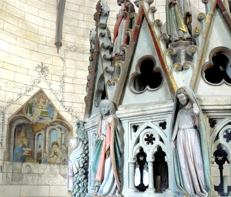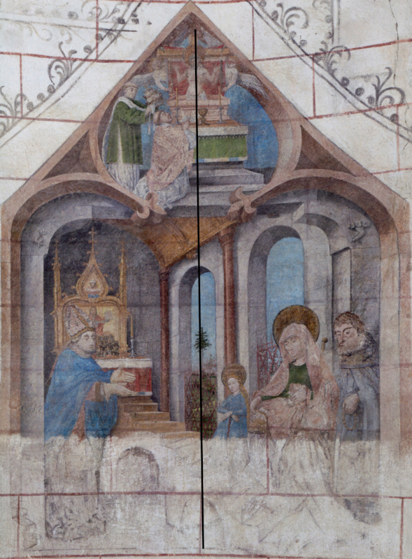 Erstaunlich ist die Kombination und Komposition der beiden Bildthemen der Malerei: Tempelgang Mariens und Gregorsmesse erscheinen in einer Art Haus zusammengefügt. Das vorchristliche Thema im Tempel unten gipfelt in der Erscheinung Christi als Haupt der christlichen Kirche oben – eine räumliche, temporale, aber auch sakrale Hierarchie.Die Abbildung Marias als Tempeljungfrau war sicherlich ...
