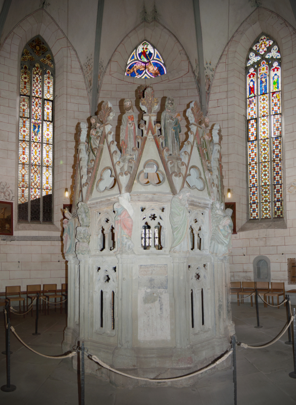 mehr anzeigenWer heute in der Mauritiusrotunde seinen Blick in die Höhe wandern lässt, wird mit einem besonderen Licht- und Farbenspiel belohnt: Große Glasfenster beleuchten den Kirchenraum und das Heilige Grab. Es sind moderne Rekonstruktionen der alten Farbverglasung, die ab 1320 über Jahrhunderte in der Rundkirche zu sehen war.Dem Einbau der hohen gotischen Glasfenster ging die Umgestaltung von Konrads Gründungsbau voraus. Um 1300 wurde er vollständig im Stil der Gotik umgebaut. Es war der größte Umbruch in der Baugeschichte der Rotunde: Sie wurde erhöht, eingewölbt und ihr Boden angehoben, um sie an den neu entstehenden Münsterkreuzgang anzuschließen. Den Abschluss bildete der um 1317 und 1320 entstandene Fensterschmuck: Über dem Scheitel der Ostkapelle wurde ein riesiges Dreipassfenster mit dem Drachenkampf des Heiligen Michael eingefügt. Rechts und links davon durchbrechen das Klingenberg- und das Ornamentfenster den Rundbau. Für diese umfangreichen Bauarbeiten muss auch das bereits 1260 angefertigte Heilige Grab ab- und wieder aufgebaut worden sein. Doch weshalb dieser Aufwand?