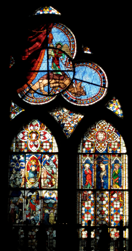mehr anzeigenBesonders erstaunlich an den Spitzbogenfenstern der Mauritiusrotunde sind deren schlichte figürliche Darstellungen, die zudem doppelt auftauchen: Gleich zwei Mal ist Christus am Kreuz und darüber sein Antlitz zu sehen. Auch die prachtvolle Michaelsscheibe ist in ihrer Monumentalität ungewöhnlich und zeugt von der Fertigkeit der Konstanzer Glasmaler-Werkstatt.Die außergewöhnliche Komposition und Ikonografie der Fenster ist auf den Kontext der Rotunde abgestimmt: Ihre hoch oben positionierten Motive sind von jedem Standpunkt im Raum über das Heilige Grab hinweg sichtbar. Sobald der Betrachter den Rundbau betritt, wird er mit einem Blick in die Höhe an die Kreuzigung Christi erinnert. Sie erscheint als in die Ferne gerücktes Golgota, von dem der Leichnam Christi in den darunter stehenden Grabbau gelegt wird. So wird seine Funktion als Aufbewahrungsort des Opferleibes Christi während der Kartage verdeutlicht. Der tote Erlöser soll im Grabbau imaginiert und so auch seine Passion kontempliert werden.
