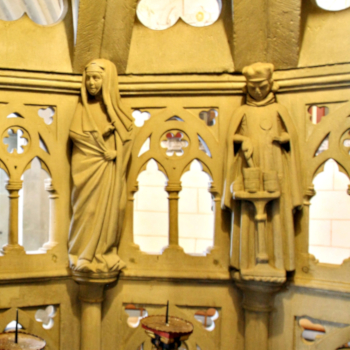 Der Figurenzyklus im Inneren des Konstanzer Heiligen Grabes beginnt mit dem nur selten dargestellten Salbenkauf. Die Szene umfasst vier Skulpturen, darunter die drei Marien aus dem Markus-Evangelium sowie die Figur des Apothekers. Die drei Marien kommunizieren über Blicke und Zeigegesten miteinander. So verweisen sie schrittweise auf das Ziel ihres Weges, den Apotheker. Er wird in den Evangelien nicht explizit erwähnt, ist jedoch eine beliebte Figur bei der Ausgestaltung der Geschichte in Osterspielen. Seine in sich gekehrte und konzentrierte Haltung lenkt die Aufmerksamkeit nach unten auf die Zubereitung der Salben. Liebevoll gestaltete Details wie das Brillenglas des Apothekers, die Gefäße für die Salben und richtungsweisende Stoffdrapierungen tragen zum besonderen Reiz dieser Szene bei. weniger anzeigen