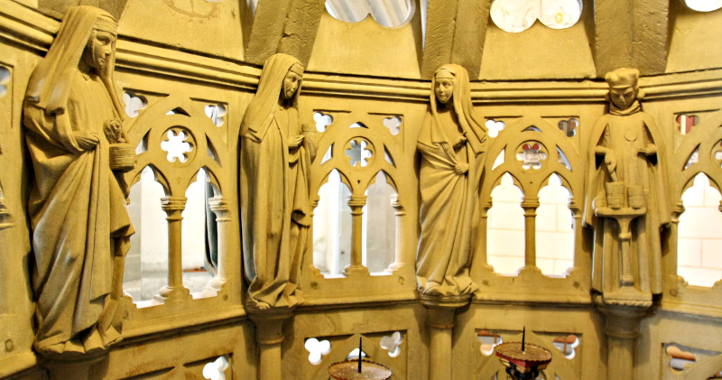 Der Figurenzyklus im Inneren des Konstanzer Heiligen Grabes beginnt mit dem nur selten dargestellten Salbenkauf. Die Szene umfasst vier Skulpturen, darunter die drei Marien aus dem Markus-Evangelium sowie ... mehr anzeigen