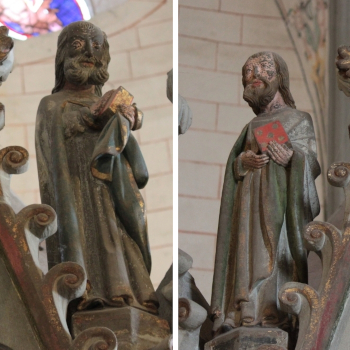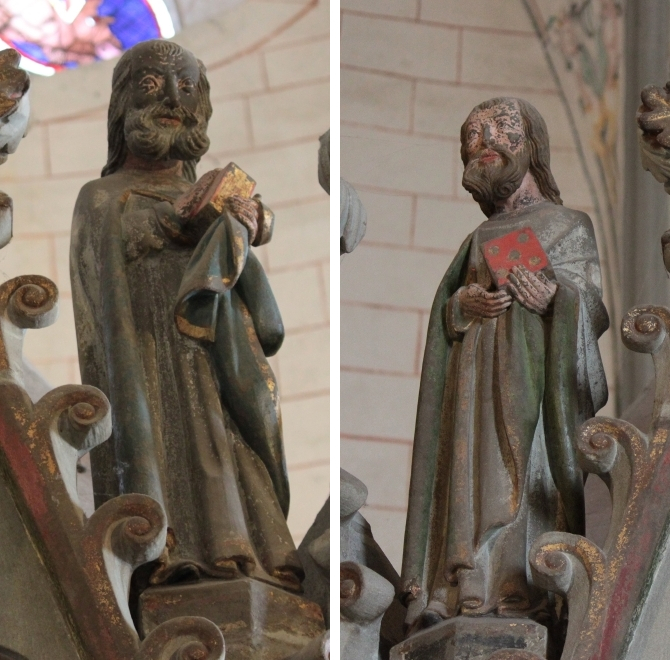 Judas Thaddäus (links) lässt sich am ehesten durch seinen gespaltenen Bart identifizieren. Er ist eng verknüpft mit Simon Zelotes, der hier am Heiligen Grab entweder links oder rechts von ihm positioniert ist.