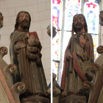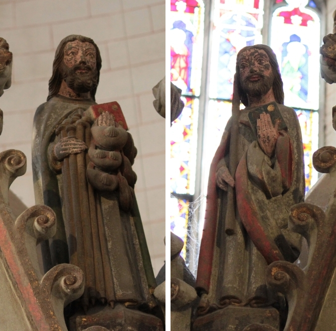 mehr anzeigenJakobus der Jüngere (rechts) hält eine Walkerstange, ein Gerät zur Reinigung von Wäsche. Der Apostel soll damit erschlagen worden sein.Jakobus der Ältere (links) ist als Pilger mit Pilgerstöcken und Brottaschen dargestellt, auf denen sein Symbol, die Jakobsmuschel, abgebildet ist. Er ist über Melchior positioniert, der vor Maria und dem Kind kniet. Dabei lenkt dieser den Blick auf eine nackte Fußsohle, ein bemerkenswertes Detail bei einem König. Vielleicht ist darin ein Verweis auf die Rotunde als Pilgerziel zu sehen - Melchior verkörpert den Pilger, der die Muttergottes und das Kind anbetet, und Jakobus ist ihm als Patron zugeordnet. weniger anzeigen