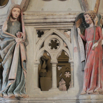 Die Ankündigung der Geburt Jesu wird im Lukas-Evangelium als Dialogszene beschrieben. Verkündigungsengel und Maria am Heiligen Grab sind einander zugewandt, dennoch stehen sie sich weder direkt gegenüber noch kreuzen sich ihre Blicke. Der Betrachter ist aufgefordert die Szene zu vollenden, indem er die Leerstellen füllt und die Skulpturen zueinander in Beziehung setzt.