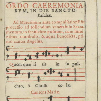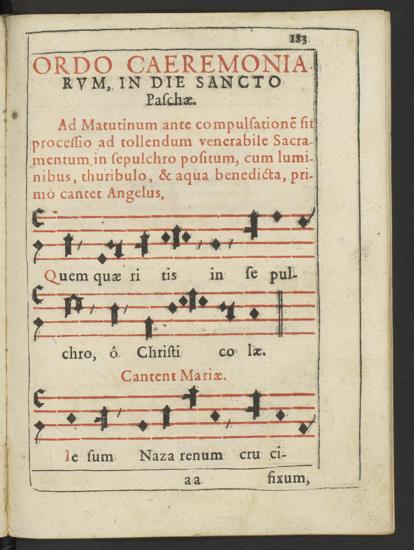 - Quem quaeritis: im Anschluss an die Elevatio, Wechselgesang zwischen den Marien und den Engeln am Grabe