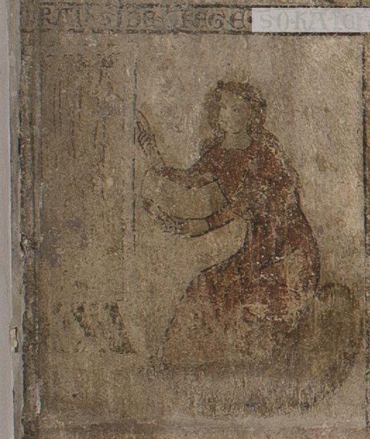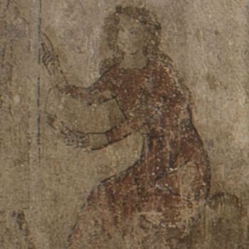 Auf dem ersten Bild der dritten Zeile begegnet dem Betrachter ein rot gekleidetes Mädchen mit offenen Haaren, welches in ihrem roten Kleid die auf Abwechslung zielende Kleiderordnung des Zyklus ein weiteres Mal unterbricht. Es sitzt seitlich auf der Bank auf einem Kissen und benutzt beide Hände, um an einem aufgestellten Rahmen zu arbeiten. Dabei folgt ihr Blick ihren Händen.