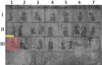Mit diesem Bild wird ein Wechsel in die Seidenproduktion vollzogen, was das Vokabular des Titulus bestätigt. Wunderlich geht von einem Verschreiber von "KAN" zu "RAN" aus, so dass man übersetzen kann: "Ich kann Seide ziehen." Hier zieht das Mädchen also Seidenfäden in einem Holzrahmen auf und bemüht sich mit dem Werkzeug, der Spelte, die Fäden zu entwirren. Bildfeld II, 2 zeigt den entsprechenden Arbeitsschritt bei der Leinenproduktion. weniger anzeigen