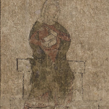 "So sitze ich hier und verbringe meine Zeit mit beten." Die in sich gekehrte Betende wird von Wunderlich als eine Begine verstanden, die im Stundenbuch liest. Zu sehen ist jedoch kein Akt der Lektüre: die aufgeschlagenen Seiten sind nach vorne gewandt, ein Finger ist in den Falz gelegt. Der grüne Umhang rahmt das zentrale Motiv rautenförmig und gibt den Blick auf das rote Gewand frei, das in einem tiefen V-Ausschnitt bis zum Schoß sichtbar wird. weniger anzeigen