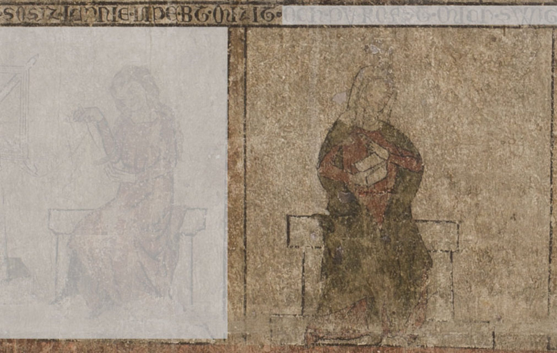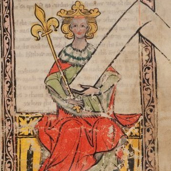 In den Illustrationen der Weingartner Liederhandschriften thront Kaiser Heinrich VI. ähnlich frontal auf einer Bank. Auch die grün-rot geschichtete Kleidung ist vergleichbar.