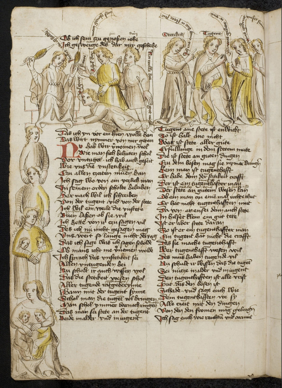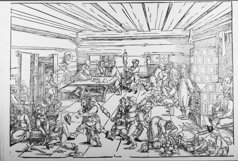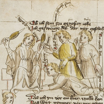 Die Gender-Dimension der Bilder lässt sich jedoch noch anders wenden: Nicht als von männlichen Theologen für Frauen propagiertes Tugendideal, sondern als Spiel mit erotischen Vorstellungen, die im Bild freigesetzt werden. Die Betrachtung der Weberinnenfresken innerhalb eines Minne-Diskurses, der um die Anmut und Schönheit der Geliebten, aber auch um deren (Un)Erreichbarkeit und die ... mehr anzeigenDie Gender-Dimension der Bilder lässt sich jedoch noch anders wenden: Nicht als von männlichen Theologen für Frauen propagiertes Tugendideal, sondern als Spiel mit erotischen Vorstellungen, die im Bild freigesetzt werden. Die Betrachtung der Weberinnenfresken innerhalb eines Minne-Diskurses, der um die Anmut und Schönheit der Geliebten, aber auch um deren (Un)Erreichbarkeit und die körperliche Erfüllung kreist, erweist sich als äußerst ergiebig. Die Lesart wird bildintern vor allem durch die stets überbetonte Körpernähe der Handgriffe, die Analogiebildung von Material und Körperteil(en) sowie die Inhalte der letzten drei Bildfelder provoziert. Vergleiche mit Darstellungen entsprechender Handwerkstätigkeiten zeigen, dass die Konstanzer Weberinnen die Werkzeuge grundsätzlich (zu) nah am Körper halten. Hinzu kommen auffällige Positionen der Geräte zwischen den Beinen, auf dem Schoß oder in Brusthöhe. Die dargestellte Technik der Tuchproduktion lässt somit auch an Techniken der (körperlichen) Liebe denken.Auch in schriftlichen Minnelehren und ihrer Illustration kann die Kunkel zu einem wichtigen Attribut werden, mit dem die Frau Begehren auslöst, aber auch gegen Zudringlichkeiten gerüstet scheint (Abb. 1). Neuzeitliche Verordnungen zeigen, dass die Spinnstube zur Gefahr für die strikte Trennung der Geschlechter werden konnte. In einer drastischen Darstellung von Beham Bartel aus dem 16. Jahrhunderts wird sie sogar zum Schauplatz eines bordellartigen Treibens (Abb. 2). weniger anzeigen