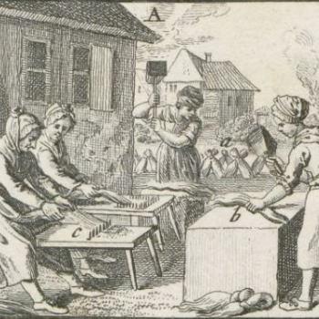 • Abb. 2 von 3 - Bildquelle: Universitätsbibliothek der Humboldt-Universität zu Berlin, Johann Ulrich Schellenberg, Tafel XXXIII (Ausschnitt) zu Kapitel 5: Flachs und Hanf. Das Spinnen in: Johann Sigmund Stoy, Bilder-Akademie für die Jugend Band 2, 1784, Kupferstich.