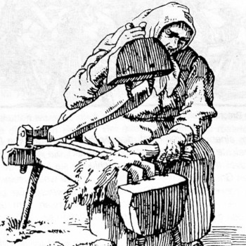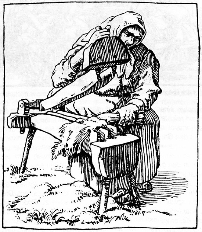 • Abb. 3 von 3 - Bildquelle: Illustration von Zeller Hanfbrecherin, Auf der Brechstatt, Reyhing, A., Albheimat, in: M. Flad: "Flachs und Leinen. Vom Flachsanbau, Spinnen und Weben in Oberschwaben und auf der Alb", Schwabenverlag Ostfildern, 1984