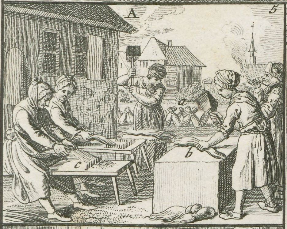 Die Arbeit des Brechens wird in anderen Abbildungen als eine sehr grobe und kraftaufwändige Tätigkeit gezeigt. Sie ist entsprechend im Stehen ausgeführt worden (siehe auch Abb. 3).