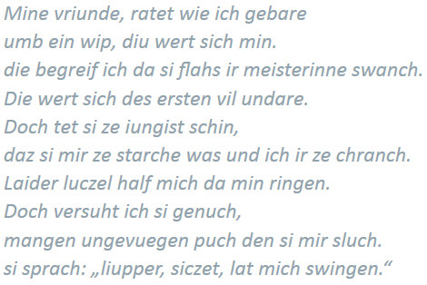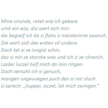 mehr anzeigenAuch durch die Texte wird die körperlich-erotische Konnotation des Zyklus verstärkt. Bereits die Tatsache, dass die Texte das Geschehen nicht aus einer übergeordneten Position kommentieren, sondern den Weberinnen in den Mund gelegt werden, sorgt für eine ungewöhnliche Nähe zum Betrachter.Dabei können die Weberinnen zu durchaus drastischen Formulierungen greifen. Von besonderer Bedeutung ist der Titulus zu Bild III, 6 "ich lig hie als all fude sol hinder dem ofen ist mir wol". In seiner Überlänge war er den Bildgestaltern offenbar so wichtig, dass man dafür starke Verschiebungen und Verkürzungen der anderen Tituli in Kauf genommen hat. fude lässt sich wörtlich nicht anders als Vulva übersetzen. Nicht nur, dass hier das weibliche Geschlecht explizit benannt wird. Auch in der ambivalenten Bedeutung als "Spottname für Frauen" oder als metonymische Bezeichnung für ein Mädchen oder eine Magd nimmt die Irritation nicht ab, betrachtet man die dargestellte Frau, die ihrer Kleidung nach weder Magd noch Anlass für Spott ist.