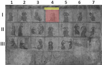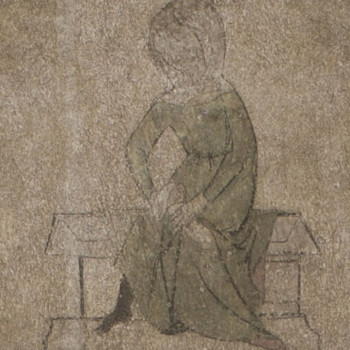 Im nächsten Bild sitzt scheinbar dieselbe Frau auf der Bank wie im zweiten Bild – eine Annahme, die vom weiterhin abwechselnden Farbspiel der Gewänder unterstützt wird. Die Frau mit Gebende ist leicht nach rechts gewandt und wiederum mit einer schoßzentrierten Tätigkeit beschäftigt. In der Bewegung hat sich offensichtlich der grüne Rock leicht verschoben, so dass er den Blick auf den ... mehr anzeigenIm nächsten Bild sitzt scheinbar dieselbe Frau auf der Bank wie im zweiten Bild – eine Annahme, die vom weiterhin abwechselnden Farbspiel der Gewänder unterstützt wird. Die Frau mit Gebende ist leicht nach rechts gewandt und wiederum mit einer schoßzentrierten Tätigkeit beschäftigt. In der Bewegung hat sich offensichtlich der grüne Rock leicht verschoben, so dass er den Blick auf den schwarz beschuhten Fuß und den Knöchel freigibt.