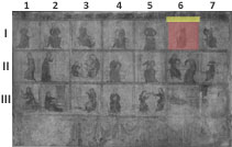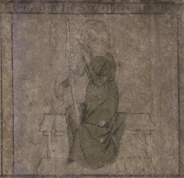 Im vorletzten Bild der ersten Zeile findet man erstmalig die beiden Hände der grün bekleideten Figur nicht in Schoßhöhe. Die rechte Hand jongliert auf Kniehöhe geschickt mit einer Handspindel, die linke hantiert auf Gesichtshöhe. Zwischen die Knie geklemmt, hält die Weberin den bereits im vorigen Bild anzutreffenden länglichen Stab – die Kunkel.Das Bild zeigt einen Arbeitsschritt, ... mehr anzeigenIm vorletzten Bild der ersten Zeile findet man erstmalig die beiden Hände der grün bekleideten Figur nicht in Schoßhöhe. Die rechte Hand jongliert auf Kniehöhe geschickt mit einer Handspindel, die linke hantiert auf Gesichtshöhe. Zwischen die Knie geklemmt, hält die Weberin den bereits im vorigen Bild anzutreffenden länglichen Stab – die Kunkel.