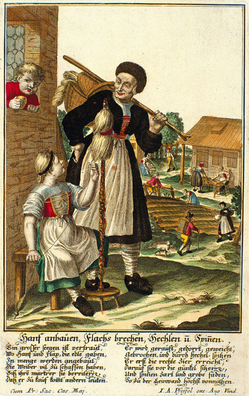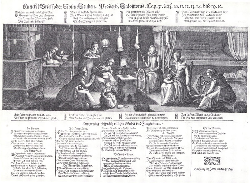 Das Bild zeigt einen Arbeitsschritt, bei dem die Weberin das rohe Hanfgarn von der Kunkel auf die Handspindel spinnt. Die gehechelte Rohfaser wird auf der Kunkel befestigt, die freie Hand zupft aus diesem Vorgarn Fasern, dreht sie auf die Handspindel auf und lässt sie so zum Faden werden (vgl. auch Abb. 2 und 3). Die Weberin, die mit der rechten Hand die Handspindel kreiseln lässt, sagt von sich "So kann ich es gut spinnen" ("SO KAN ICH ES WOL GESPINEN" ) Mit dem Attribut "WOL" unterstreicht sie ihre besondere Fertigkeit. Dabei deutet die Haltung der linken Hand auf eine Bewegung in Richtung Mund: die Finger werden – in einem wenig vornehmen körperlichen Akt – mit der Zunge benetzt, um das rohe Garn besser greifen zu können. weniger anzeigen