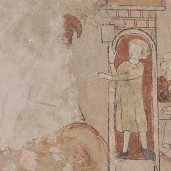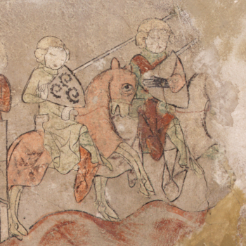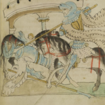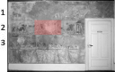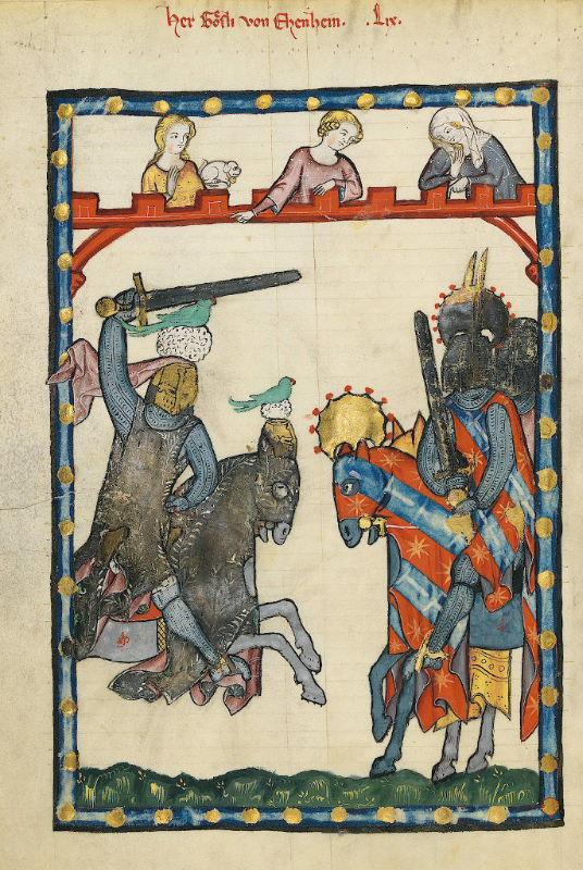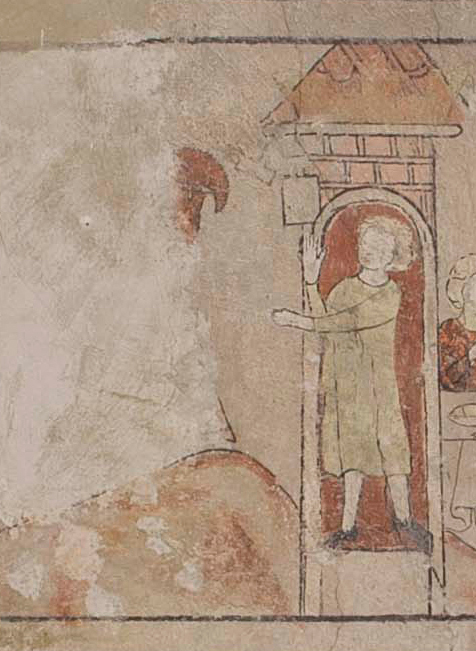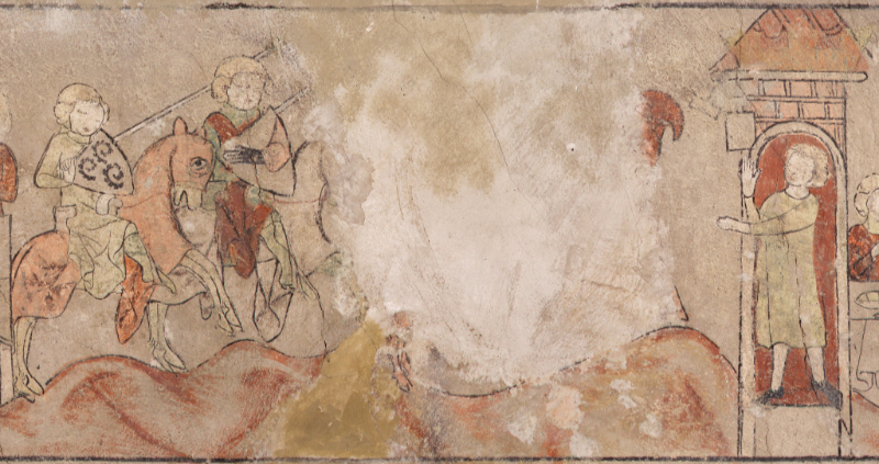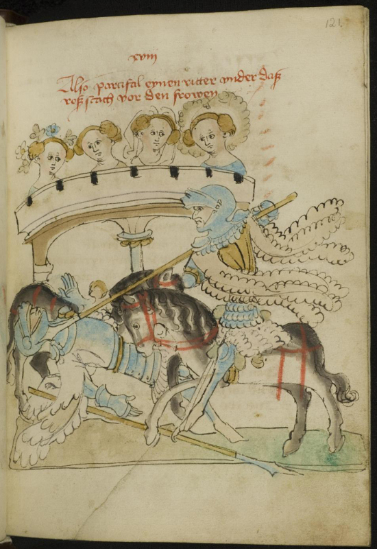 Da Parzival im Roman auf seinem Ritt nach Graharz keine Begleitung hat, spricht einiges dafür, dass das Konstanzer Fresko auch in dieser Darstellung mehrere Romanszenen überblendet. Wenn man die Fragmente des rechten Reiters als den in voller Rüstung reitenden Roten Ritter deutet, kann dieser sowohl im Moment seiner Ankunft als auch beim später von Gurnemanz zu seiner Ausbildung angeordneten Turnier gesehen werden. Die unbehelmten (ein Zeichen für Friedfertigkeit) "juncherren" wären dann einmal sein Willkommengeleit in die Burg und ein anderes Mal seine Übungspartner während des Kampfunterrichts. Und der zunächst grüßend auf der Schwelle seiner Burg stehende Gurnemanz kann dann auf dem Fresko zugleich auch den Befehl zum praktischen Rittertraining für Parzival geben und dieses dann von den Zinnen seiner Burg aus überwachen. Pars pro toto wird diese von dem schmalen turmartigen Gebäude mit Mauerwerk, Ziegeldach und Rundbogentor repräsentiert. Die bildliche Darstellung reduziert die Eposhandlung hier also auf Grundschemata und -konstellationen, die zwar an Detailtreue verlieren, sich dafür aber für eine mehrfache Szenen-Ausdeutung öffnen. weniger anzeigen