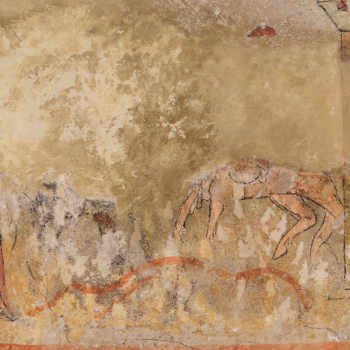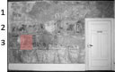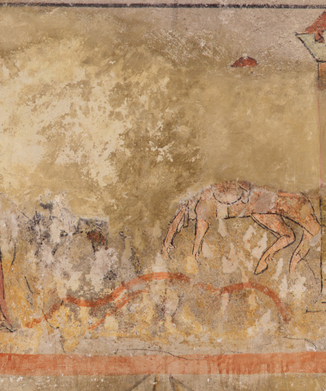 Von diesem Bildfeld ist außer den Fragmenten zweier Pferdekörper nicht viel erhalten. Das schwarze Pferd auf der linken Seite steht einem rötlichen Ross gegenüber, eine rot gewellte Linie deutet den Erdboden an. Von den Reitern ist nichts mehr auszumachen, lediglich der Rand einer roten Helmzier oberhalb des hellen Pferdes ist übrig geblieben.Beiden im letzten Abschnitt beschriebenen ...
