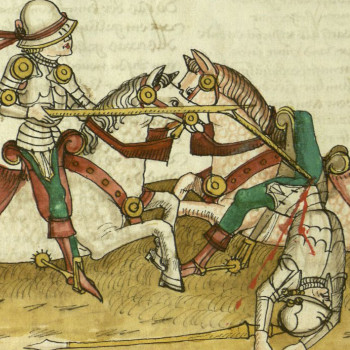 Parzival kann am roten Helmbusch und an der Farbe seines Pferdes identifiziert werden. Er siegt über seinen auch räumlich unterlegenen Gegner, dessen Pferd auf einem etwas tiefer liegenden Geländeabschnitt dargestellt wird. Vielleicht können wir in einigen Farbspuren unterhalb des Rumpfes noch Reste des besiegten Ritters erkennen, wie ihn auch einige Parzivalhandschriften zeigen. weniger anzeigen