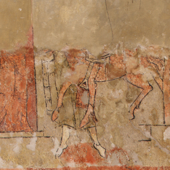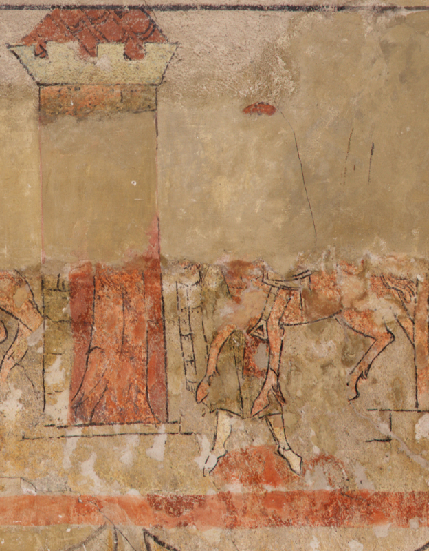 Die Szene des Zweikampfs wird rechts durch einen hohen Turm begrenzt. Die Spitze des Daches ist durch den oberen Rand der Bildzeile abgeschnitten. Im Turm, dessen mittlerer Teil nicht erhalten ist, steht eine nach rechts gewandte Figur in einem roten, bodenlangen Kleid. Neben dem Turm ist ein nach links gerichtetes Pferd zu sehen, Sattel und Steigbügel sind deutlich zu erkennen. An Stelle ... mehr anzeigenDie Szene des Zweikampfs wird rechts durch einen hohen Turm begrenzt. Die Spitze des Daches ist durch den oberen Rand der Bildzeile abgeschnitten. Im Turm, dessen mittlerer Teil nicht erhalten ist, steht eine nach rechts gewandte Figur in einem roten, bodenlangen Kleid. Neben dem Turm ist ein nach links gerichtetes Pferd zu sehen, Sattel und Steigbügel sind deutlich zu erkennen. An Stelle des vierten Beines steht rechts eine Art Holzpflock. Die Hufe des Pferdes schweben eigenartig in der Luft. Hinter dem Pferd steht auf abgesenktem Grund eine Person in einem knielangen Gewand. Sie ist frontal dem Betrachter zugewandt. Zwischen ihr und dem Turm befindet sich ein senkrecht aufgerichteter länglicher Gegenstand, der durch Querlinien strukturiert ist.Die Figur im Turm kann durch ihr rotes, langes Gewand, das bereits in der ersten Szene dieser Zeile zweifach zu sehen ist, als Condwiramurs identifiziert werden. Der Ritter mit Pferd stellt folglich Parzival dar, der zu ihr zurückkehrt. Wie schon in der vorigen Szene ist er an einem kleinen Rest der Helmzier zu erkennen.