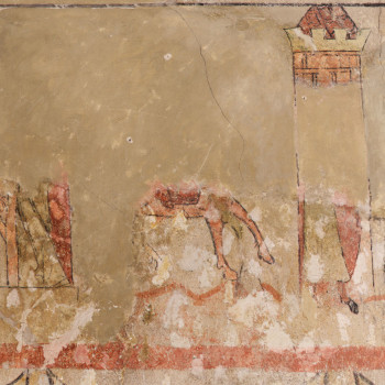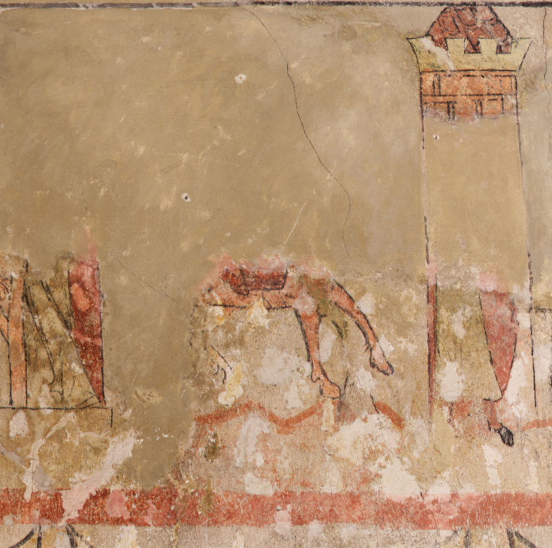 Links ist der Sockel eines schmalen Gebäudes zu sehen, auf dem wieder eine Figur in rotem Kleid steht. Rechts davon ist ein nach rechts gerichtetes Pferd dargestellt. Statt des Sattels ist ein roter Saum zu sehen, was wiederum auf einen reitenden Ritter schließen lässt. Das Pferd bewegt sich auf einen Turm zu. Dort steht eine Gestalt, die den Reiter empfängt. Von der Figur im Turm ist nur noch die untere Hälfte sichtbar, sie trägt ein wadenlanges helles Gewand und schwarze Schuhe.