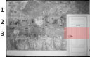 Auch in der unteren Bildzeile wurde der letzte Abschnitt durch den Einbau der Tür komplett zerstört. Über die Inhalte der verlorenen Bildfelder kann daher wieder nur spekuliert werden. Der verbleibende Platz ist nicht ausreichend, um die Geschichte des Parzival bis zu seiner Aufnahme in die Gralsrunde komplett zu Ende erzählen zu können. Daher muss ein geeigneter Schlusspunkt gefunden ... mehr anzeigenAuch in der unteren Bildzeile wurde der letzte Abschnitt durch den Einbau der Tür komplett zerstört. Über die Inhalte der verlorenen Bildfelder kann daher wieder nur spekuliert werden. Der verbleibende Platz ist nicht ausreichend, um die Geschichte des Parzival bis zu seiner Aufnahme in die Gralsrunde komplett zu Ende erzählen zu können. Daher muss ein geeigneter Schlusspunkt gefunden worden sein. Für Wunderlich (1996) besteht dieser Schluss darin, dass Parzival zum Artusritter ernannt wird. Vor der Aufnahme in die Artusrunde (Abb. 5) könnte eine Kampfszene wie der Kampf gegen Orilus (Abb. 2 und 3) und sehr wahrscheinlich die Blutstropfenszene (Abb. 4) zu sehen gewesen sein: im frisch gefallenen Schnee sieht Parzival drei Blutstropfen aus den Wunden einer verletzten Wildgans. Durch den Farbkontrast des roten Bluts im weißen Schnee sieht er in den Tropfen das Gesicht seiner Condwiramurs und aus Liebe und Sehnsucht verfällt er in eine Art Trance. Im Rahmen der dritten Bildzeile könnte diese Szene auch ein Pendant zum blutigen Boden nach dem Sieg über Clamide dargestellt haben.Angenommen, die verlorenen Bildfelder zeigten tatsächlich die Blutstropfen und die Aufnahme als Artusritter, so würde die dritte Bildzeile eine Serie erfolgreich bestandener Prüfungen zeigen, die mit der Eheschließung und Befreiung des belagerten Pelrapeire beginnen würde. Einzig der Besuch auf der Gralsburg wäre als eine Art retardierendes Moment in die Geschichte aufgenommen worden.
