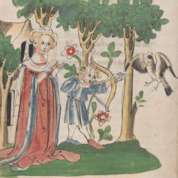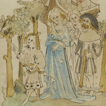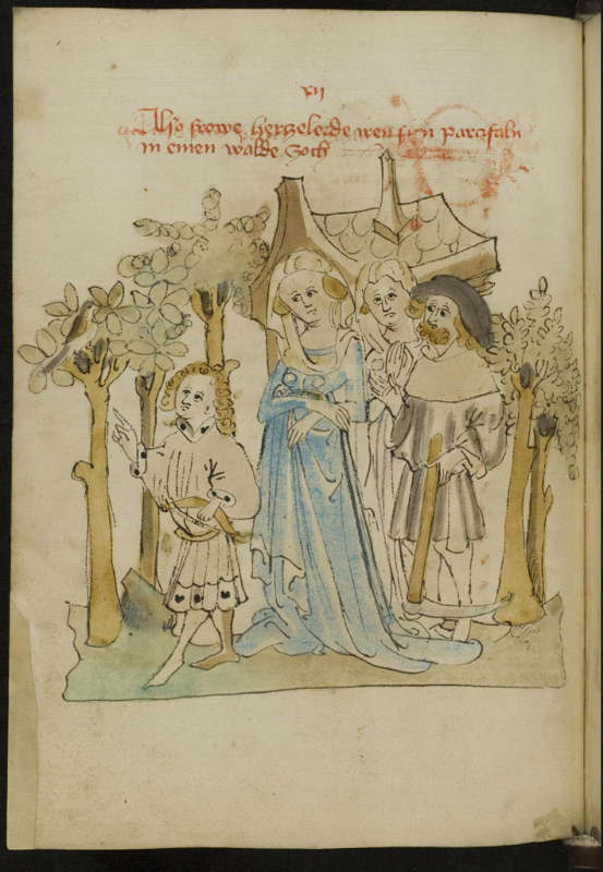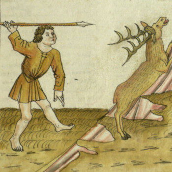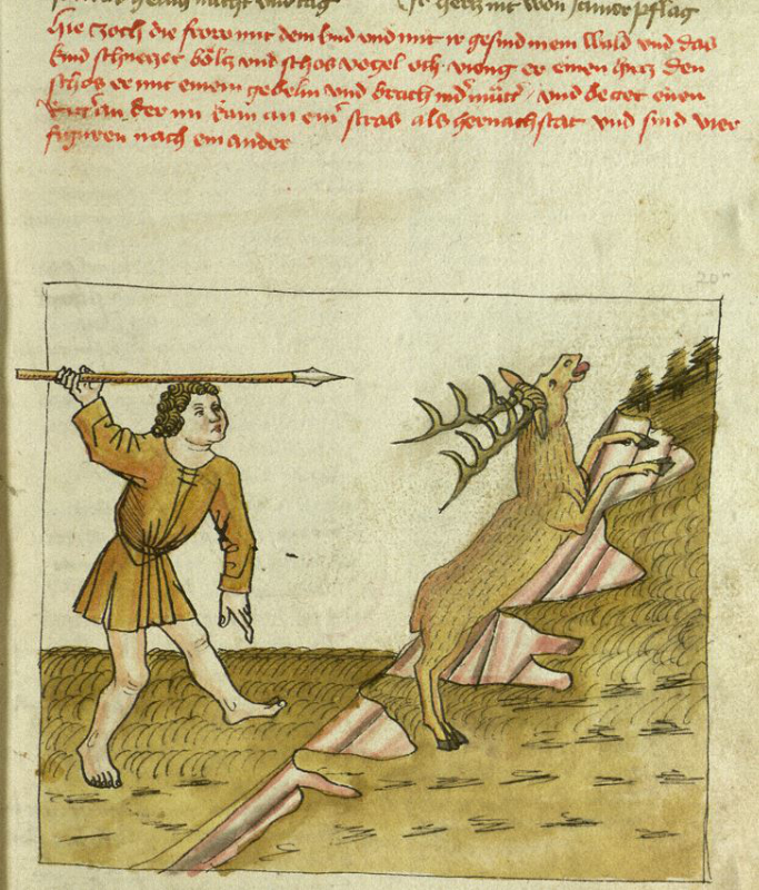 Für die Szene nach der Geburt kommen zwei Jagdszenen in Frage. Die Darstellung einer Vogeljagd (Abb. 2 und 3) oder die Darstellung einer Hirschjagd (Abb. 4). Die Vogeljagd kann als allgemeine Charakterisierung seiner Lebensumstände nach dem Umzug nach Soltane fungieren, die Hirschjagd leitet als besonderes Ereignis auf die anschließende Begegnung mit den Rittern über. weniger anzeigen