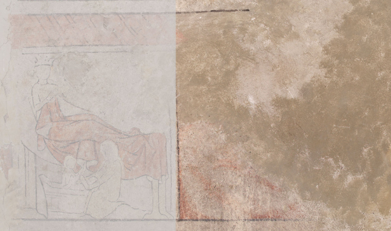 mehr anzeigenEin breites Bildfeld unmittelbar neben der Geburtsszene ist komplett zerstört. Durch den Vergleich mit Eschenbachs Textvorlage und illustrierten Parzivalhandschriften kann über den verloren Inhalt gemutmaßt werden. Vermutlich handelte es sich um zwei Szenen, von denen die erste Parzival auf der Jagd zeigte.Herzeloyde zog nach Parzivals Geburt mit ihm und ihrem Gefolge in den Wald bei Soltane. Um ihm das Schicksal seines Vaters zu ersparen, der als Ritter im Kampf tödlich getroffen wurde, wollte die Mutter ihren Sohn fernab vom Hofe aufziehen. Ihre Dienerschaft wurde angehalten, Parzival gegenüber kein Wort über das höfische und ritterliche Leben zu verlieren. Parzival vertrieb sich die Zeit in der Natur, häufig mit der Jagd nach Vögeln und Hirschen.
