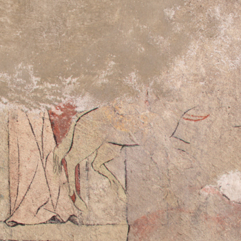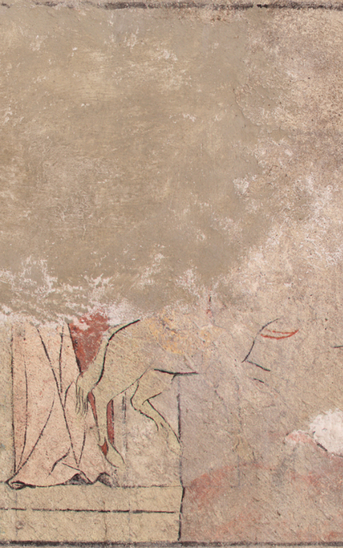 Auch die Abschiedsszene von Parzival und Herzeloyde ist nur noch fragmentarisch erhalten, die obere Hälfte des Bildfeldes fehlt. Auf einem Fundament, das als Andeutung eines festen Gebäudes betrachtet werden kann, ist die untere Körperhälfte einer in weite Gewänder gehüllten Figur zu sehen – vermutlich Herzeloyde. Die Körperhaltung lässt darauf schließen, dass sie dem kleinen Pferd ... mehr anzeigenAuch die Abschiedsszene von Parzival und Herzeloyde ist nur noch fragmentarisch erhalten, die obere Hälfte des Bildfeldes fehlt. Auf einem Fundament, das als Andeutung eines festen Gebäudes betrachtet werden kann, ist die untere Körperhälfte einer in weite Gewänder gehüllten Figur zu sehen – vermutlich Herzeloyde. Die Körperhaltung lässt darauf schließen, dass sie dem kleinen Pferd nachschaut, das sich nach rechts entfernt. Auf dem Pferd ist andeutungsweise ein Körper auszumachen, es handelt sich um Parzival, der sich auf den Weg in die weite Welt macht.Begleitet von den letzten Ratschlägen seiner Mutter reitet Parzival frohgemut davon. Von ihm unbemerkt bleibt die tiefe Traurigkeit Herzeloydes, die wohl auch im Konstanzer Fresko nicht in ihren Auswirkungen dargestellte wurde: Sie stirbt am Abschiedsschmerz, sobald Parzival außer Sichtweite ist. In Eschenbachs Epos preist sie der Erzähler als "rechte Mutter" wie "wir heutzutage ihresgleichen nicht mehr haben" (Spiewok, Band 1, S. 221). weniger anzeigen