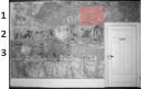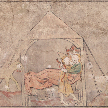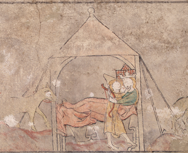 Die nach bisheriger Zählung sechste Szene des Parzivalzyklus zeigt ein Zelt mit Giebeldach. Links und rechts sind jeweils zwei Seile vom Dachansatz zum Boden gespannt. Rechts sieht man sogar zwei eingeschlagene Zeltnägel. Die bogenförmige Öffnung an der Vorderseite gibt den Blick in das Zeltinnere frei. Dort ist wie in der ersten Szene ein Bett zu sehen, in welchem eine gekrönte Frau mit ... mehr anzeigenDie nach bisheriger Zählung sechste Szene des Parzivalzyklus zeigt ein Zelt mit Giebeldach. Links und rechts sind jeweils zwei Seile vom Dachansatz zum Boden gespannt. Rechts sieht man sogar zwei eingeschlagene Zeltnägel. Die bogenförmige Öffnung an der Vorderseite gibt den Blick in das Zeltinnere frei. Dort ist wie in der ersten Szene ein Bett zu sehen, in welchem eine gekrönte Frau mit langen blonden Haaren liegt, ihr Oberkörper lehnt aufrecht am rechten Bettende. Auch die Haltung der Dame, sowie das faltenreiche rote Tuch erinnern stark an Herzeloydes Darstellung in der Geburtsszene. Vor dem Bett steht ein junger Mann in einem kurzen Kleid und mit einem spitz zulaufenden Hut. Er trägt einen roten Bogen über die Schulter gehängt und liebkost die Wange der Frau. Sie reagiert mit einer Umarmung und hält seinen Oberkörper mit beiden Händen umfangen. Auf der linken und rechten Seite des Zeltes ist jeweils ein Maultier zu sehen. Beide sind in der Bewegung nach rechts dargestellt.Gezeigt ist hier Parzivals Besuch bei Jeschute, der Gemahlin des Herzogs Orilus von Lalant. Sie ist in Wolframs Epos die erste Dame, der Parzival nach dem Abschied von seiner Mutter begegnet. Ein weiteres mal wird hier die dreiste Naivität Parzivals ausgemalt: Er dringt in das Zelt der vornehmen Dame ein, findet die wunderschöne Frau in Abwesenheit des Gatten schlafend vor und entsinnt sich der Ratschläge, die seine Mutter ihm mit auf den Weg gegeben hat: "Kannst du von einer edlen Frau Ring und freundlichen Gruß erringen, so greife zu, denn es vertreibt alle trüben Gedanken. Zögere nicht lange beim Küssen und schließe sie fest in die Arme." (Spiewok, Band 1, S. 219ff.). So schreitet Parzival ohne große Überlegung zur Tat, ringt der entrüsteten Jeschute Umarmungen und Küsse ab und stiehlt ihr schließlich ihren Fingerring und eine Brosche.