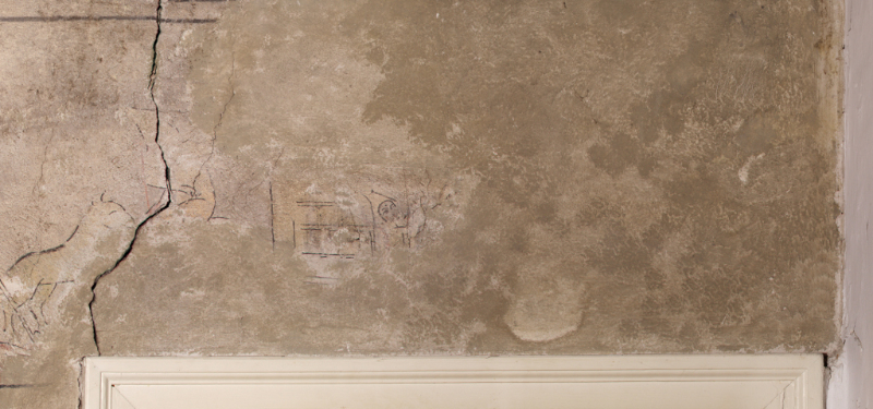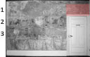 Die Jeschuteszene ist in der ersten Zeile des Freskos das letzte eindeutig erkennbare Bildfeld. Weiter rechts ist durch den Türdurchbruch das Bildmaterial zerstört. Einige wenige Konturen lassen die weitere Handlung erahnen: Erkennbar ist ein Gesicht mit dem Ansatz einer Kappe, die analog zur Jeschuteszene ergänzt werden kann. Links davon sind einige waagrechte und senkrechte Linien zu ... mehr anzeigenDie Jeschuteszene ist in der ersten Zeile des Freskos das letzte eindeutig erkennbare Bildfeld. Weiter rechts ist durch den Türdurchbruch das Bildmaterial zerstört. Einige wenige Konturen lassen die weitere Handlung erahnen: Erkennbar ist ein Gesicht mit dem Ansatz einer Kappe, die analog zur Jeschuteszene ergänzt werden kann. Links davon sind einige waagrechte und senkrechte Linien zu sehen, die als gemalte Mauersteine zu einem Gebäude gehört haben mögen. Noch weiter links – zwischen Parzivals Pferd, das sich von Jeschutes Zelt entfernt und den beschriebenen Linien – kann eine weitere sitzende Figur erahnt werden. Der Rest der Wand bis zur rechten Ecke besteht nur noch aus grauem Putz.Angesichts der Handlung in der zweiten Zeile des Freskos, die damit beginnt, dass Parzival mit Iwanets Hilfe die rote Rüstung Ithers anlegt, können Vermutungen über die verlorenen Szenen angestellt werden. Im Epos gibt es zwischen der Begegnung mit Jeschute und dem Anlegen der Rüstung drei Episoden, die für eine bildliche Darstellung in Frage kommen: Zunächst trifft Parzival nach dem Abschied von Jeschute seine Base Sigune, die ihren im Kampf gefallenen Mann Schionatulander beweint. Aufgrund seines Mitgefühls gibt sie sich als Verwandte zu erkennen und informiert ihn über seine wahre königliche Herkunft. Im Anschluss an diese Begegnung überzeugt er mit Jeschutes Brosche einen geizigen Fischer, ihn bei sich übernachten zu lassen und ihm den Weg zu Artus zu zeigen. Daran schließt sich als dritter Handlungsschritt der Kampf mit Ither an, in dessen Verlauf er diesen tötet und so die Rüstung erkämpft, die er später mit Iwanets Unterstützung anlegt.