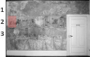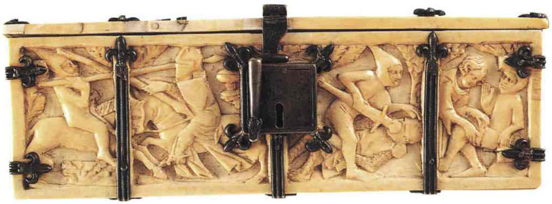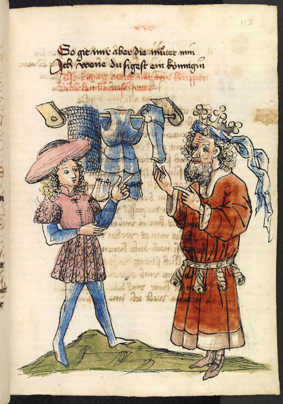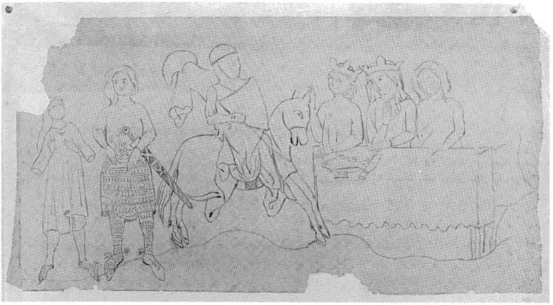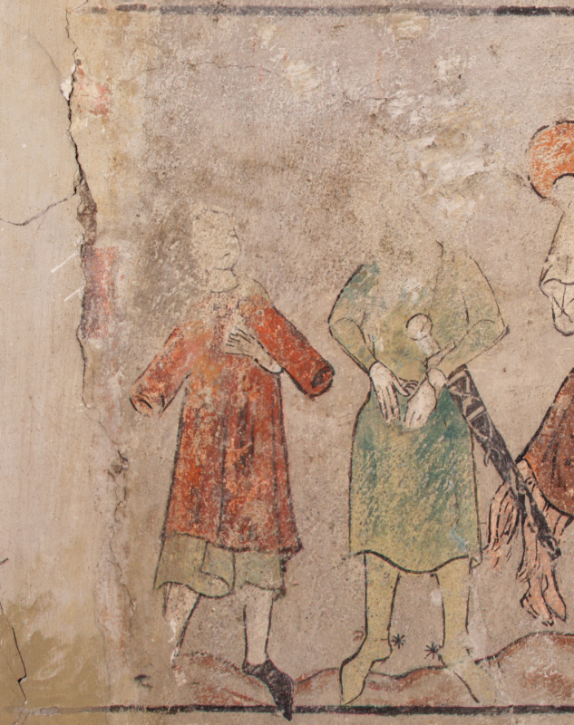 Die erste Szene im mittleren Bildregister zeigt zwei stehende Personen. Sie sind frontal zum Betrachter hin ausgerichtet, aber dennoch durch ihre analoge Grundhaltung und die Stellung der Füße aufeinander bezogen. Ihre nur wadenlangen, grünen Gewänder kennzeichnen beide als männliche Figuren. Während der Kopf der rechten Figur nicht mehr zu erkennen ist, lässt sich das Gesicht der ... mehr anzeigenDie erste Szene im mittleren Bildregister zeigt zwei stehende Personen. Sie sind frontal zum Betrachter hin ausgerichtet, aber dennoch durch ihre analoge Grundhaltung und die Stellung der Füße aufeinander bezogen. Ihre nur wadenlangen, grünen Gewänder kennzeichnen beide als männliche Figuren. Während der Kopf der rechten Figur nicht mehr zu erkennen ist, lässt sich das Gesicht der linken noch erahnen. Es ist dem Gegenüber zugewandt und befindet sich auf dessen Schulterhöhe. Die größere Gestalt trägt über hellen Beinlingen Sporen und legt sich mit beiden Händen einen Schwertgürtel an. Das Schwert mit rundem Knauf steckt in einer dunklen Scheide und hängt an der linken Körperseite. Die kleinere Person hat schwarze Schuhe an und hält ein rotes Gewand vor sich. Gut zu erkennen ist, wie ihre linke Hand unter dem abstehenden Ärmel des leer herabhängenden Kleidungsstückes nach vorne durchgreift.Die kleinere Gestalt ist der Page Iwanet sein, der Parzival hilft, die Rüstung des ‚Roten Ritters‘ anzulegen. Zu Beginn der Geschichte kam dieser Ehrentitel dem vorbildlichen Ritter Ither von Gaheviez, dem König von Kukumerland zu. Als der weltfremde Parzival diesem Ritter zufällig begegnet, fällt sein begehrlicher Blick sofort auf dessen prachtvolle rote Rüstung. Von König Artus erbettelt er sich die Erlaubnis zum Zweikampf mit Ither. Dass der völlig unerfahrene Junge im Narrenkleid den kampferprobten Ither im Kampf töten würde, hätte niemand für möglich gehalten. Doch dies geschieht nicht im ritterlich-fairen Zweikampf, sondern mit einem unerwarteten, blitzschnellen Stoß seines Jagdspeeres durch den Sehschlitz im Visier des Ritters (154, 27ff.). Erst viel später wird Parzival erfahren, dass er mit Ither einen Verwandten ermordet hat.