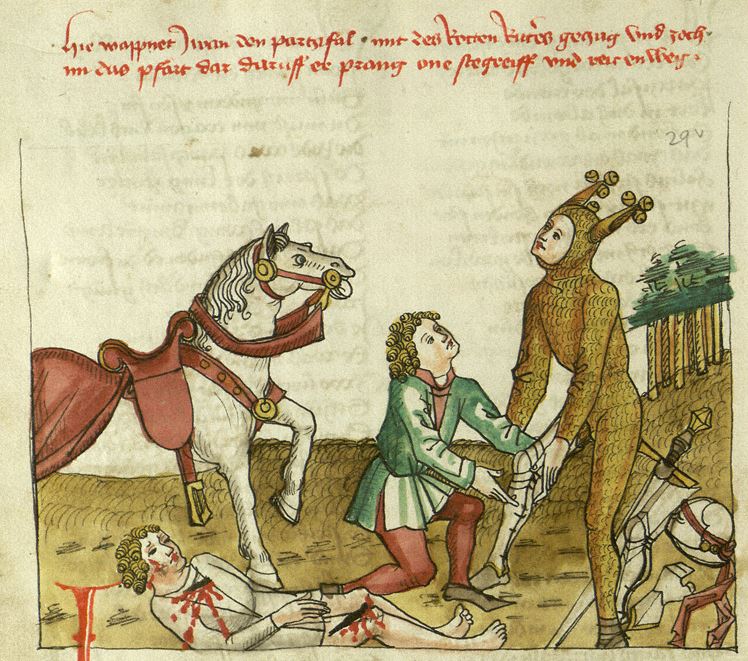 Iwanet hilft Parzival beim Anlegen von Ithers Rüstung (3. Buch, 155,19ff.)