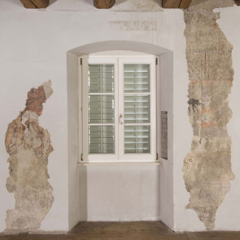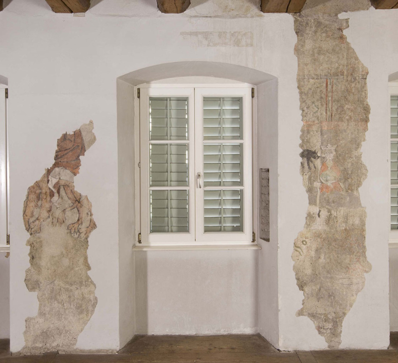 Bei einem Wanddurchbruch im Weberfreskensaal stieß man 1962 auf polychrome Farbreste an der östlichen Stirnwand. Unter dem Putz konnten zwei unterschiedlich große Freskenreste freigelegt werden, die zwischen drei verbreiterten Fenstern liegen. Links sind Reste eines Kampfes zwischen Mensch und Löwe zu erkennen. Die Ikonographie ist aus der Samsonlegende des Alten Testaments abgeleitet. ... mehr anzeigenBei einem Wanddurchbruch im Weberfreskensaal stieß man 1962 auf polychrome Farbreste an der östlichen Stirnwand. Unter dem Putz konnten zwei unterschiedlich große Freskenreste freigelegt werden, die zwischen drei verbreiterten Fenstern liegen. Links sind Reste eines Kampfes zwischen Mensch und Löwe zu erkennen. Die Ikonographie ist aus der Samsonlegende des Alten Testaments abgeleitet. Rechts davon befindet sich ein thronender Herrscher. Die fünf Tiere, die ihn umgeben, sind jeweils durch eine schwarze Verbindungslinie einem Sinnesorgan zugeteilt. Die ungewöhnliche Sinnenallegorie nimmt auf den Liber de natura rerum des Thomas von Cantimpré (1201-1270) Bezug.