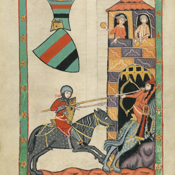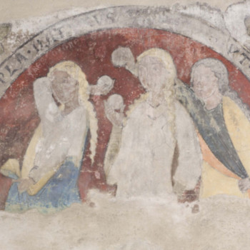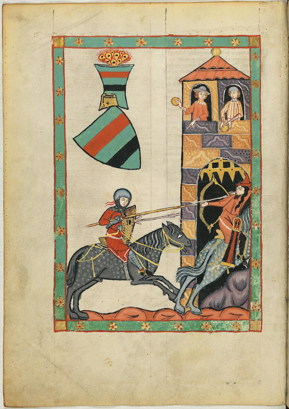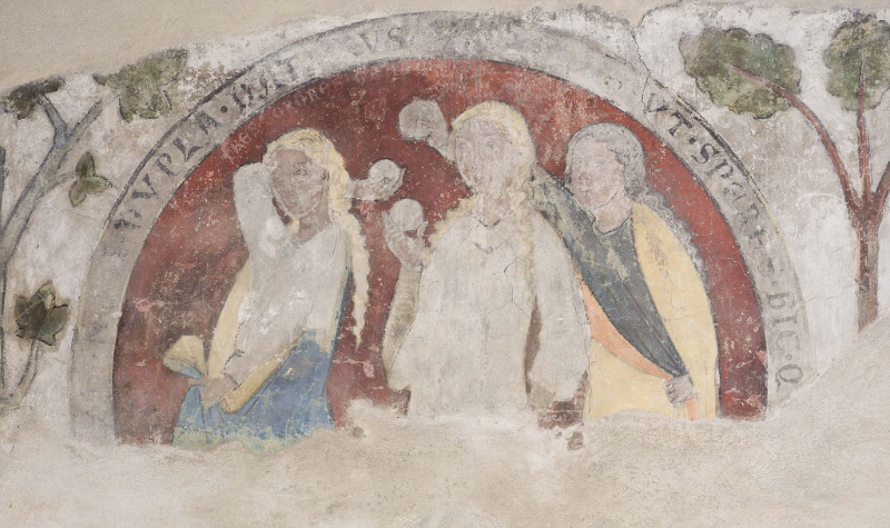 Drei weibliche Figuren bekämpfen einen unsichtbaren Gegner, der sich links außerhalb des Medaillons befindet. Ihre Körperkonturen werden von langem, lockigem Haar umspielt. Alle halten jeweils eine Kugel oder einen runden Stein in der rechten Hand. Die mittlere hält ihn in abwartender Geste zwischen Daumen und Zeigefinger. Die beiden seitlichen Figuren verkörpern unterschiedliche Phasen ... mehr anzeigenDrei weibliche Figuren bekämpfen einen unsichtbaren Gegner, der sich links außerhalb des Medaillons befindet. Ihre Körperkonturen werden von langem, lockigem Haar umspielt. Alle halten jeweils eine Kugel oder einen runden Stein in der rechten Hand. Die mittlere hält ihn in abwartender Geste zwischen Daumen und Zeigefinger. Die beiden seitlichen Figuren verkörpern unterschiedliche Phasen einer kraftvollen Wurfbewegung. Trotz der unterschiedlichen Haltungen sind die drei Wurfkugeln in der Mitte des Medaillons in einer fast wappenartigen Konstellation versammelt. Auch die Farben der Haare und Gewänder sind abwechslungsreich variiert. Die rechte Figur zieht ihren Umhang vor den Körper, die linke hält ihn gerafft, so dass sie im geschürzten Kleid weitere Steine als Nachschub bereit halten könnte. Der Hintergrund ist in diesem Medaillon rot. Aus der Umschrift ist folgendes noch lesbar:...N...DVPLA DAT...VS...VT SPE RES BIC Q. Im Bildfeld liest man TRES SORORES GRA[TIAE|]Die ikonographische Deutung gibt Rätsel auf. Die Zahl drei und die Beischrift im Bild verweisen eindeutig auf die drei Grazien und nicht auf eine im Trio kämpfende Tugendgruppe. Wunderlich nimmt dennoch die Personifikation von Tugenden an und sieht die Zahl drei durch die Aufstockung der fünf Medaillons zur klassischen Zahl von sieben Frauengestalten und Tugenden motiviert. Durch die Ausrichtung der Grazien nach links und durch die fehlenden Gegnerinnen im Bild scheinen sie recht eindeutig in die ersten drei Kämpfe einzugreifen. Die personifizierte Schönheit und Grazie scheint die Tugenden zu unterstützen oder kommt sie gar den unterlegenen Lastern zu Hilfe? Bereits die Frage unterläuft den moralisch vorgegeben Sinn eines solchen Bildprogramms. Die Deutung wird spielerisch verzögert und in den Verantwortungsbereich des Betrachters verlegt. weniger anzeigen